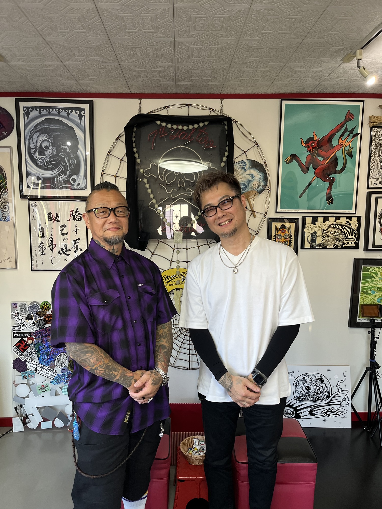 彫師になってからは自分の所属するスタジオ以外に伺う機会がなかったのですが、空間の中は彫茂さんゆかりのアートワークや小物であふれていて、見ているだけで想像が広がりとても楽しい時間でした。