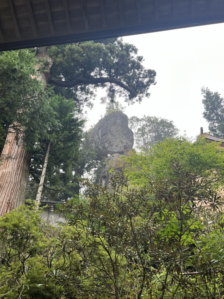 社殿の背後には、御姿岩と呼ばれる巨岩がそびえ立ち、今にも落ちてきそうに見える岩の迫力には圧倒されます。