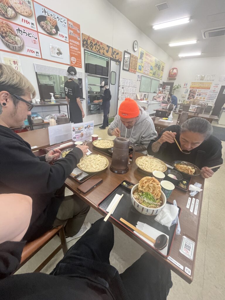 神社を参拝した後は、キャンプ場の近くにある十文字ミートの名物うどんをいただきました。